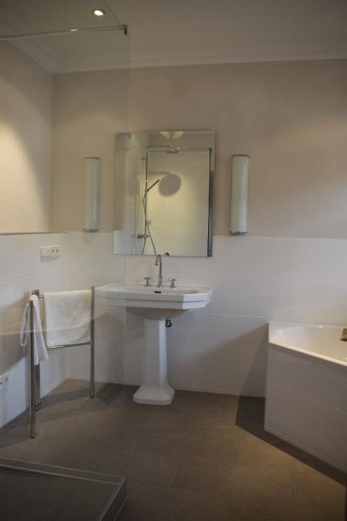 Im Erdgeschoß befinden sich neben Eingangsbereich und Diele ein Gäste-WC, der geräumige Wohn- und Eßbereich mit gemütlicher Sitzbank im rundum verglasten Erker, die offene und sehr gut ausgestattete Landhausküche und ein Schlafzimmer mit gegenüberliegendem Duschbad.